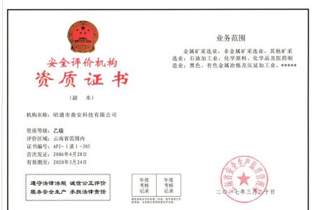 2003年11月10日,昭通市鼎安科技有限公司成立,初始主要從事第三方安全工程技術服務,經多年運營,發(fā)展為多專業(yè)綜合科技平臺,為社會提供多種專業(yè)技術服務工作。 現(xiàn)公司注冊資金為1200萬元,公司法定代表人:毛衛(wèi)旭。公司主要業(yè)務:安全評價、安全標準化評審、安全工程技術服務;環(huán)境監(jiān)測、職業(yè)衛(wèi)生檢測、檢驗;法律訴訟及非訴訟服務;司法鑒定、固定資產投資項目節(jié)能服務;工程咨詢;工程測量測繪;安全教育培訓等。是安全生產服務、安全教育培訓機構,也是環(huán)境監(jiān)測和職業(yè)衛(wèi)生服務機構,同時也是綜合的檢測檢驗、綜合科技平臺服務機構。多年來為公、檢、法、司、軍、警、海關、仲裁、安監(jiān)、工礦商貿企業(yè)、社會團體及個人提供多專業(yè)技術服務。